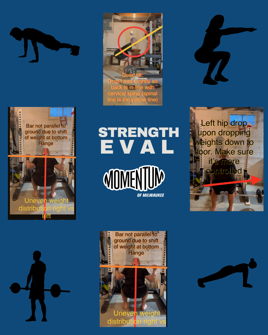 - 1-4 specific strength exercises form to improve & perfect (such as deadlifts, squats, core work, etc.)